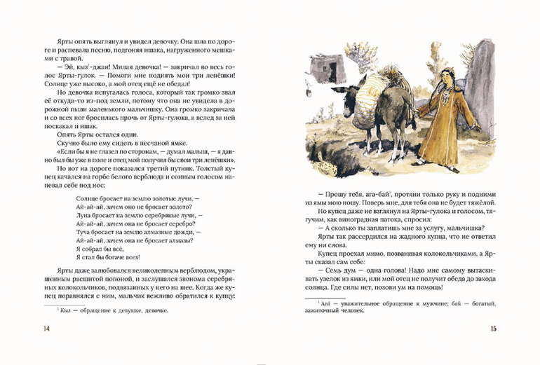 Долгие, как бороды у старцев, неспешные, словно верблюды в пустыне Каракумы, наполненные восточной мудростью и озорной хитростью туркменские сказки очаровывают и надолго запоминаются. Смелый и умный не по годам и не по росту (он едва достигает половины верблюжьего уха), мальчик Ярты-гулок стал хорошим сыном своим родителям и защитником простых людей от жадных и глупых баев и ханов.