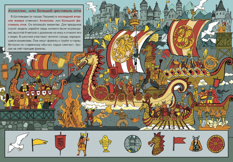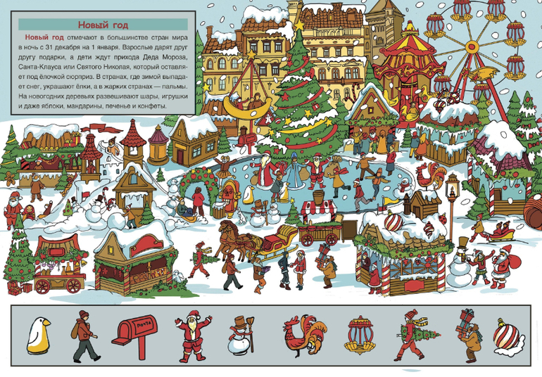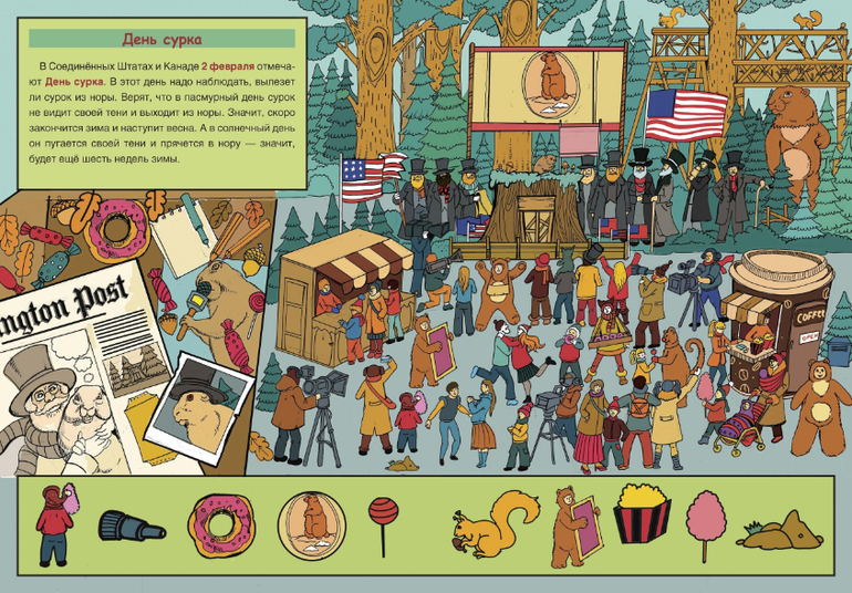 Виммельбух познакомит детей с праздниками разных стран, поможет в игровой форме узнать о традициях других народов. Листая до мельчайших деталей прорисованные иллюстрации, дети побывают на Венецианском карнавале в Италии, на Параде цветов в Голландии, примут участие в австралийской Королевской регате, Дне сурка в США, Празднике кукол в Японии, Фестивале воздушных змеев в Китае, битве томатами в Испании, Олимпиаде джентльменов в Англии и многих других событиях. На каждом развороте, помимо текста и иллюстраций, есть задание на внимательность.