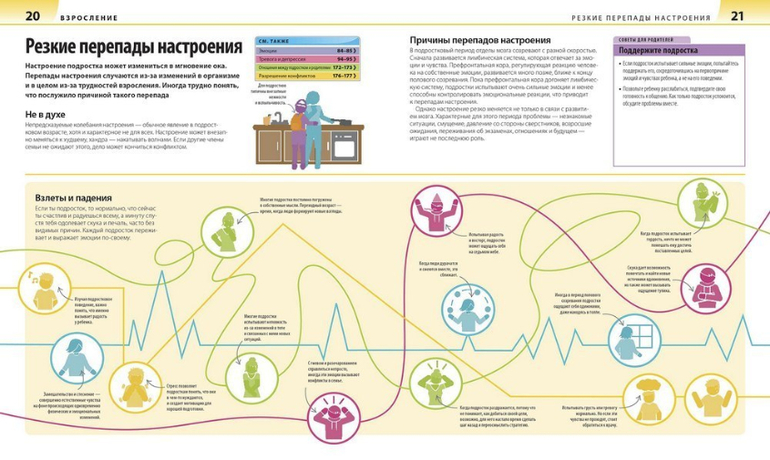 Для иллюстрации биологических изменений приводятся диаграммы, сноски и научные факты. Рисунки иллюстрируют подростков и их семьи, а также различные ситуации, которые могут случиться в жизни