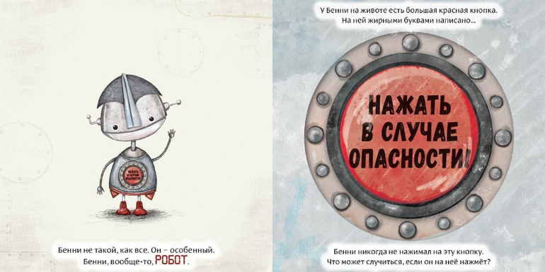 Бенни был особенным роботом, ведь у него была всего лишь одна красная кнопка. На ней большими буквами было написано: «Нажать в случае опасности!» Бенни никогда не нажимал на кнопку, но часто думал о том, что может случиться, если он на неё нажмёт. И совсем скоро он это узнает…