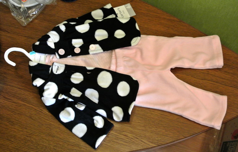 Друзья из Америки передали нам наборчик Картерс для нашей принцесски. Он такой классный! Флисовые штанишки + кофточка и хлопковое боди с коротким рукавом. Размер указан на 6 мес. Я так понимаю, что это 68 размер по нашему, т.е. как раз на весну.![]()