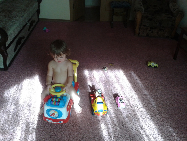 Когда Таня усадила всех пассажиров по своим местам, побежала за своей машинкой и каталась вмести с ними.