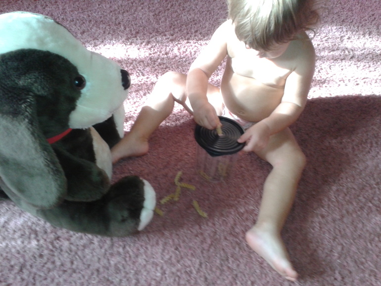 После завтрака я дала Танюшке ее любимую сенсорную коробочку с горохом и гречкой в которой спрятала животных. Когда дочка находила очередного зверя я называла кто это и мы вместе повторяли как говорит животное. Потом я ей дала чашки и ложку и попросила насыпать много и мало, с заданием Таня справилась. И еще минут 20 играла с коробочкой без меня.