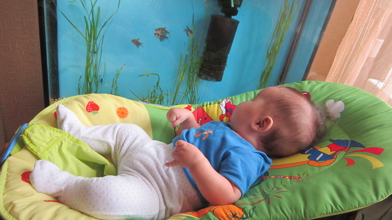 Поставили шезлонг возле аквариума,так сыночек глаз не сводил. Включила музыку на шезлонге..Он так внимательно смотрел на рыбок,долго наблюдал,еще и рассказывал им что-то !!