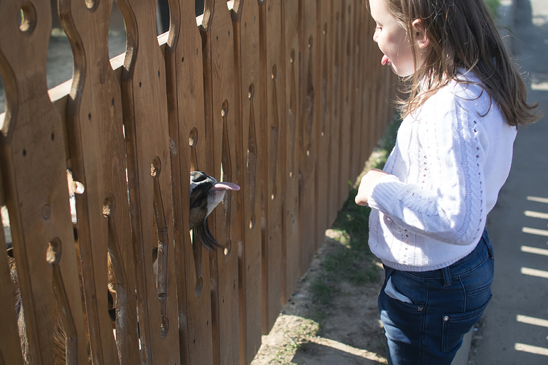Тут можно было купить морковку и кормить коз и козлят. А деньги у нас были у папы, а папа с Темой где-то разгребали камни, то мы просто показали язык) а коза в ответ!!
