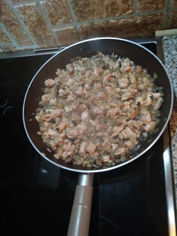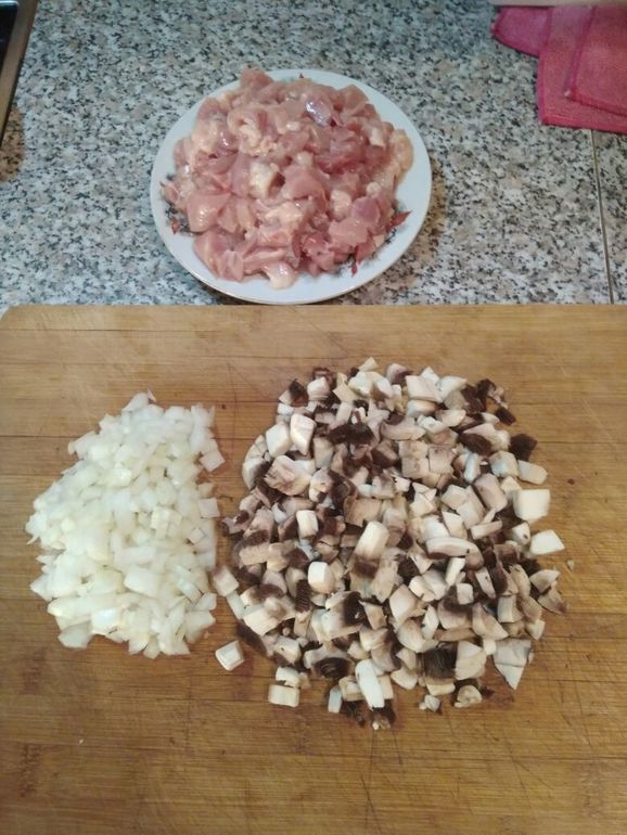 Обжариваем лук...грибы....курицу на растительном масле)))