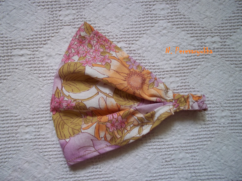 На днях сшила своей доченьке очень- очень простую, но привлекательную и удобную косыночку на резинке, как раз актуальная вещь для моря или песочницы