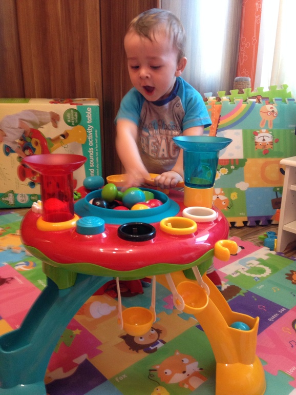 А еще поражает меня все время сообразительностью, я явно его недооцениваю, а парень все на ус мотает) взял недавно расческу свою стал сам причесываться, хотя я не учила и вообще его пртчесывала раз 5 за все время))) полюбился ему столик этот с шариками, сам сообразил как шарики там перемешивать, я вообще не видела этот рычажок) в общем помелочи но я все время в шоке)