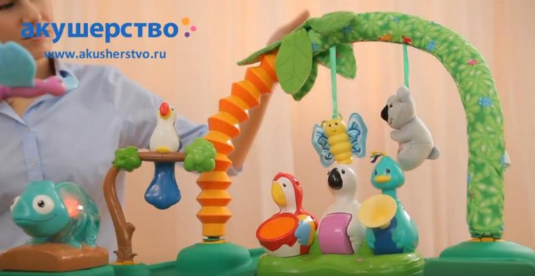 Есть ещё классный хамелеон. Он начинает играть, если происходит движение ( ребенок по нему ручкой стукнул или от того, что малыш прыгает в кресле) .