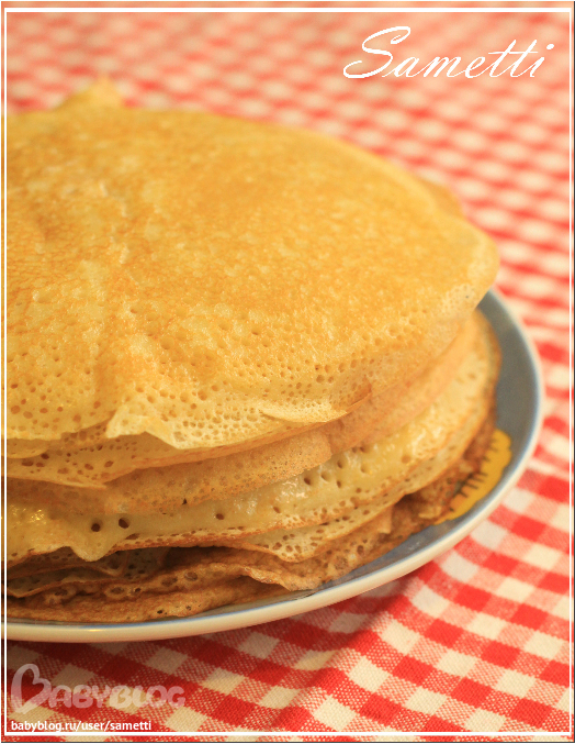ПС: совет от моей мамы: каждый блин, пока он горячий, надо смазать сливочным маслом, и укладывать их стопкой, тогда они будут еще мягче и вкуснее:) Проверено)))