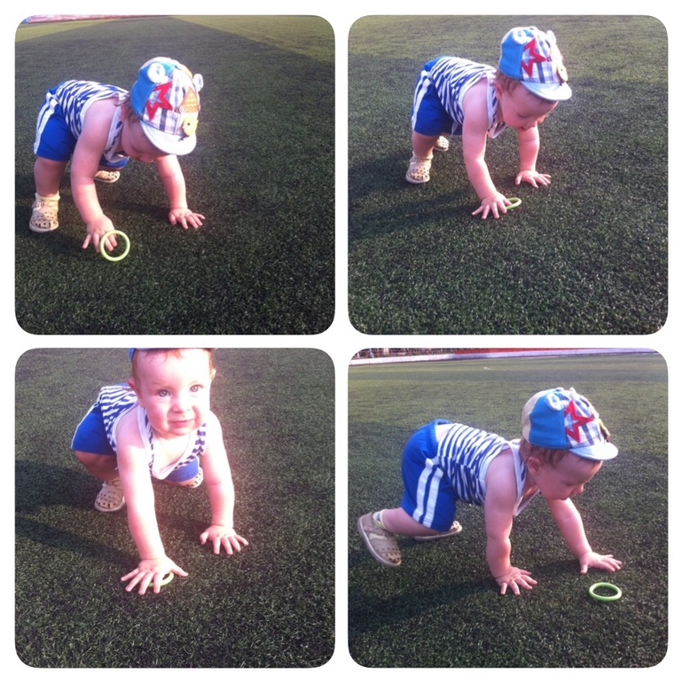 Умелки: все также реактивно ползаем, ходим быстро за руку (сам трусит, сразу кричит и садиться), иногда, по настроению машет пока-пока, хлопает в ладоши, с детками которых знает, типо здоровается (поднимает вверх руку и улыбается), пинает/кидает мяч (это наше все, футболист растет), разбирает пирамидку (не успеваю собирать уже летит ломать), любит "читать" книги (перелистывает страницы, рассматривает картинки, не грызет книги!), если хочет есть ведет меня к стульчику.