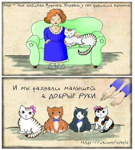Вот такой комикс разместили волонтеры тюменского Фонда помощи животным ГЛ "Потеряшки" себе в помощь на страничке в контакте. С подобным они сталкиваются ежедневно. За этими детскими на вид рисунками, жестокая реальность их трудовых будней. Думаете бездомными животными занимаются только бабульки? Вы заблуждаетесь, у многих девочек есть семьи, дети, работа, они среди вас, красивые и умные, добрые и смелые, творческие и артистичные... А еще они очень сострадательные. Говорить о судьбе животных "в добрые ручки" можно долго, упорно, а статистика очень печальна и она говорит о том что 90% таких животных оказывается не нужным никому. Эти картинки расскажут что же происходит в действительности с животными, которые люди забрали у Вас за дарма или символическую плату под видом породистого. Кстати тенденция печальна, и в Фонд попадает с каждым годом все больше и больше породистых кошек, которых люди покупают без документов. Я очень прошу Вас остановиться, посмотреть и подумать, так ли вам важно чтобы ваша кошка родила "для здоровья", "потому что она должна испытать счастье материнства", "потому что мне жалко", кстати все это мифы. Вы можете отслеживать "своих" котят, но... В состоянии ли вы отследить судьбу "своих" внуков и правнуков? Их судьба очень созвучна с судьбой кошек на этом замечательном комиксе.