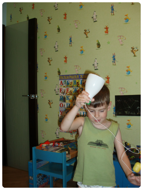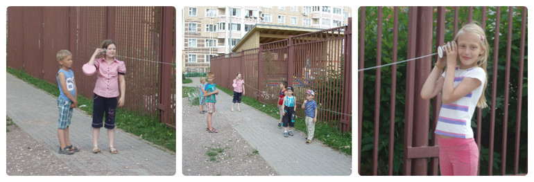 Аналогичный телефонный аппарат Глеб увидел в мультфильме и попросил меня сделать ему такой же. "Надо же, как совпало", - подумала я и побежала в магазин за одноразовыми стаканчиками. Веревку сделали длинную, но дома множество углов и она за что-то обязательно цеплялась, ухудшая звук. Решили вынести на улицу наш телефон. Пока разговаривала сама с Глебом, набежали дети, всем захотелось попробовать. Так что на фото дети чужие, своего заснять не успела. Те, кто ждал своей очереди на разговор, придумали ... играть в Лимбо, проходили под веревкой )))