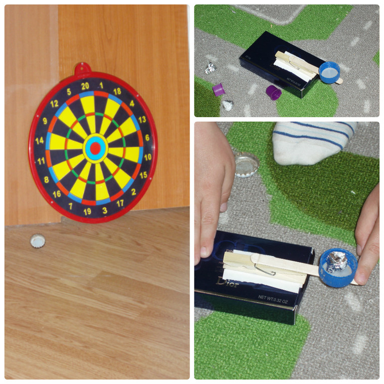 Сделали конструкцию из коробочки, прищепки, палочки от мороженого и крышечки. Собрали все на двусторонний скотч. Глеб сам нашел все "ингредиенты", я порой поражаюсь запасливости своего ребенка. Надолго заинтересовался, снаряды сделал из фольги, крышек от Здрайверов и железных крышек от пива, видимо. Мишень взяли от Дартса.