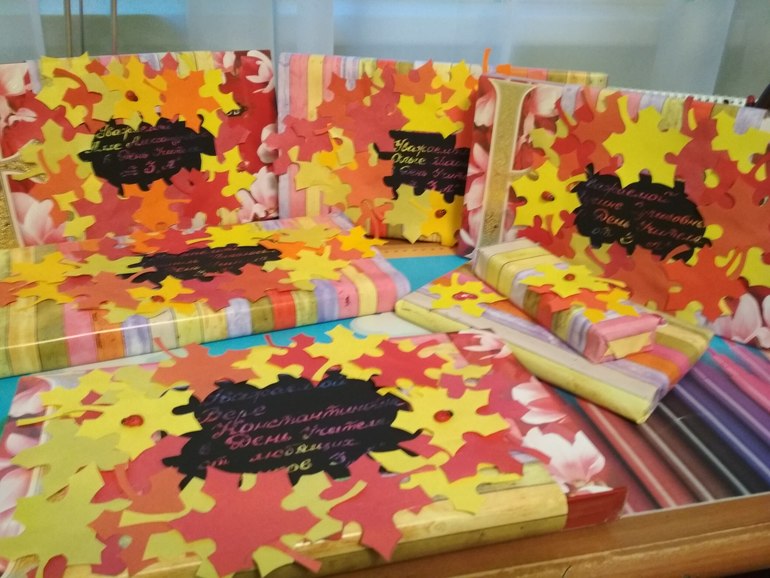 Вот так пестренько в этот раз. Учителям - предметникам конфеты и цветы. Классному руководителю тоже конфеты, да ещё блокнот и ручка именная.