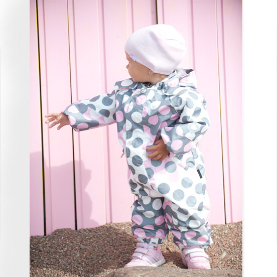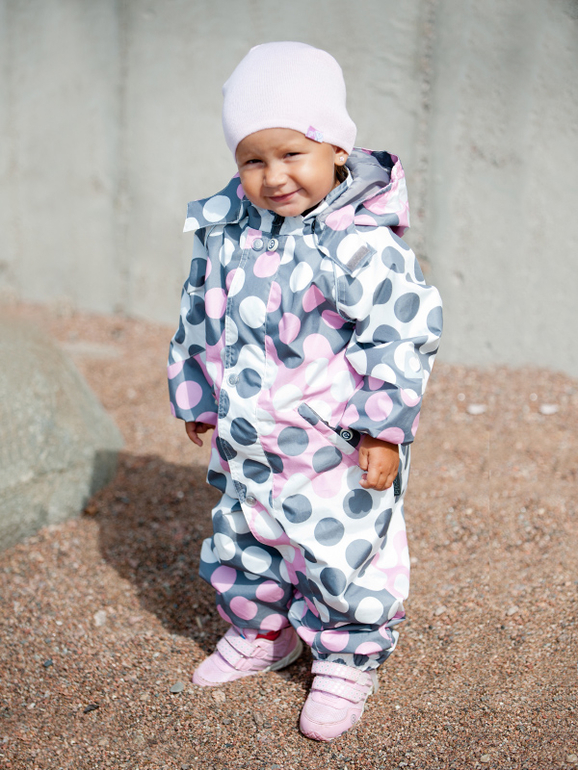 Комбинезон ясельный для девочки , пропитка 3000/3000, подклад Tricot (мягкое, приятное на ощупь трикотажное полотно из полиэстера), отстегивающиеся штрипки для фиксации на обуви, эластичные манжеты на рукавах и брючинах, светоотражающие элементы.