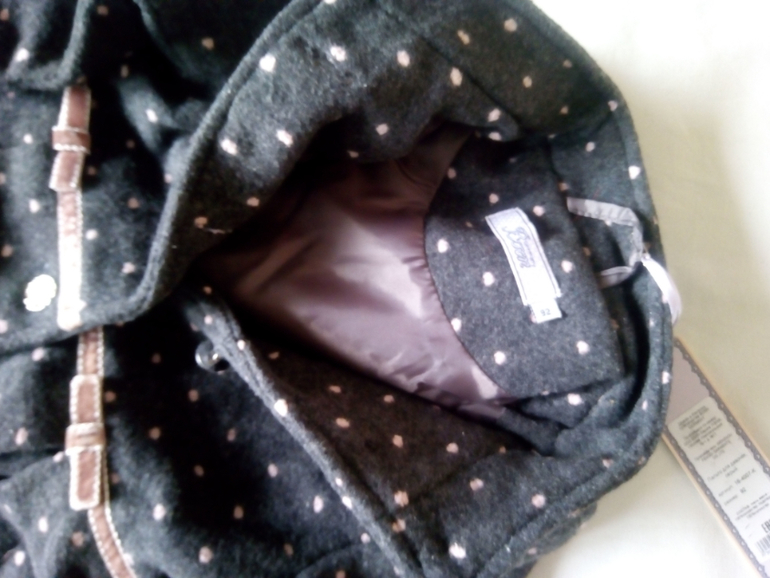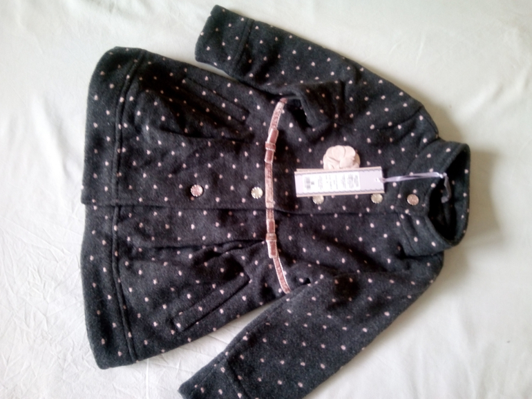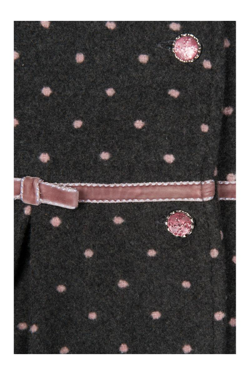 Пальто для малышки из ткани в горошек.С завышенной линией талии,воротником-стойкой и прорезными карманами в листочку.По линии подреза настрочена бархатная тесьма с бантиками.Застежка на пуговицы.Брошь-цветок.