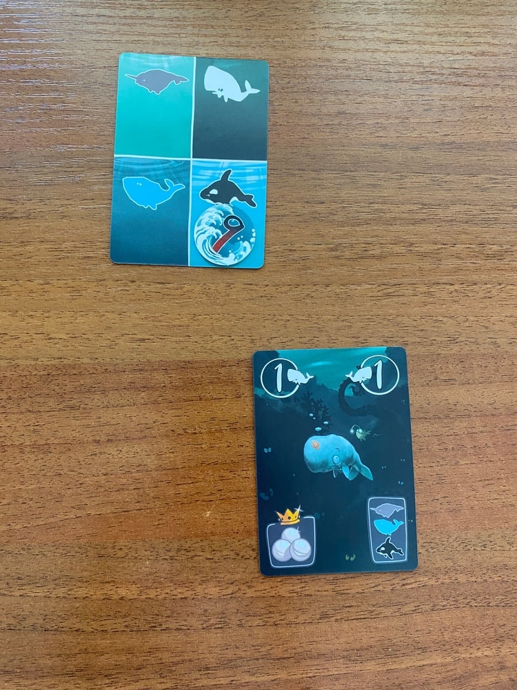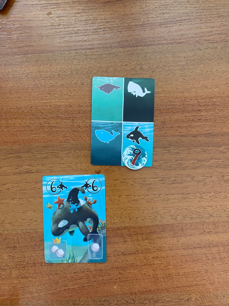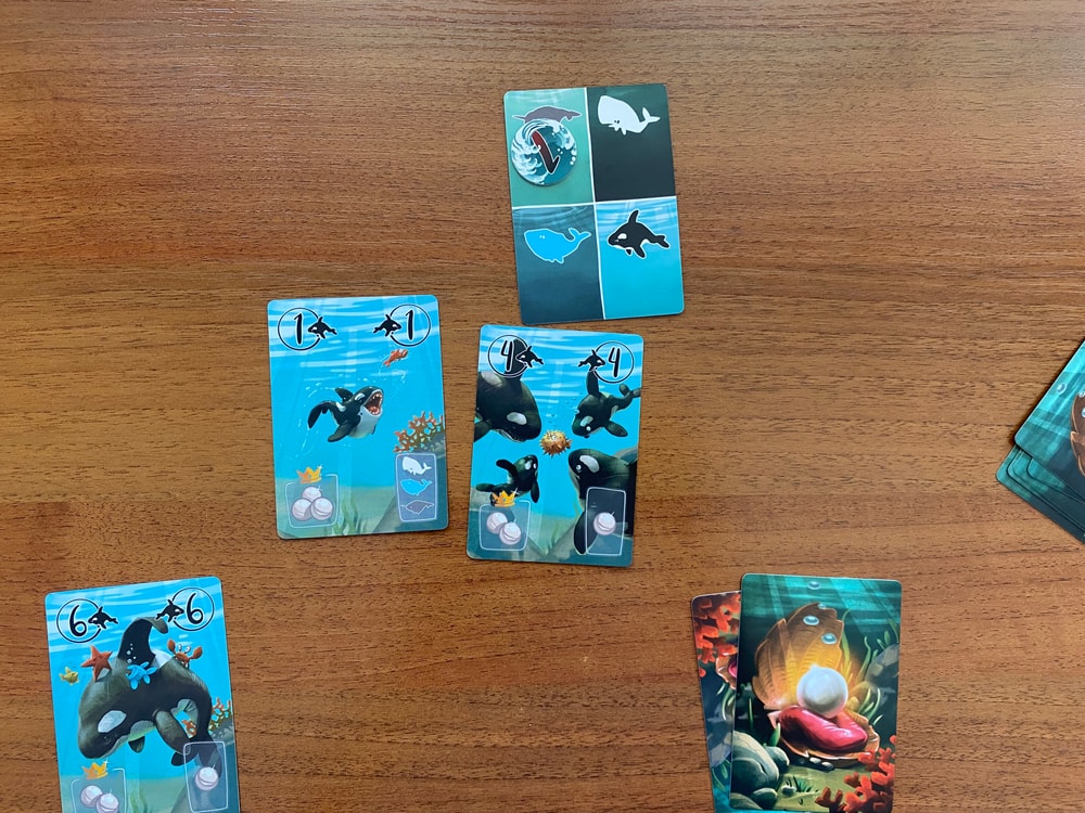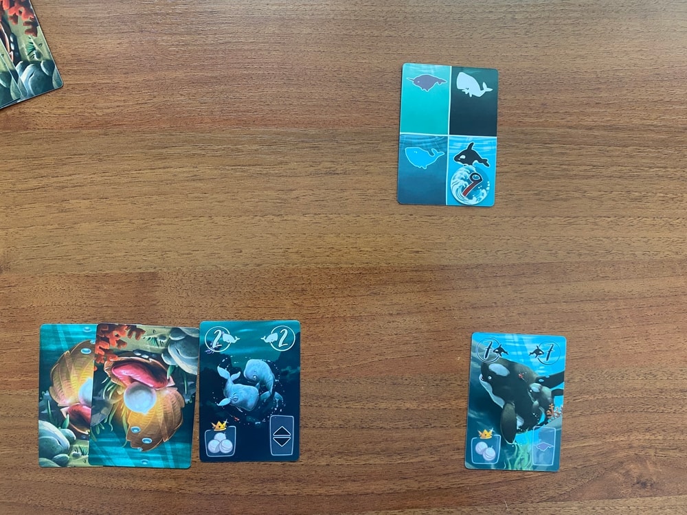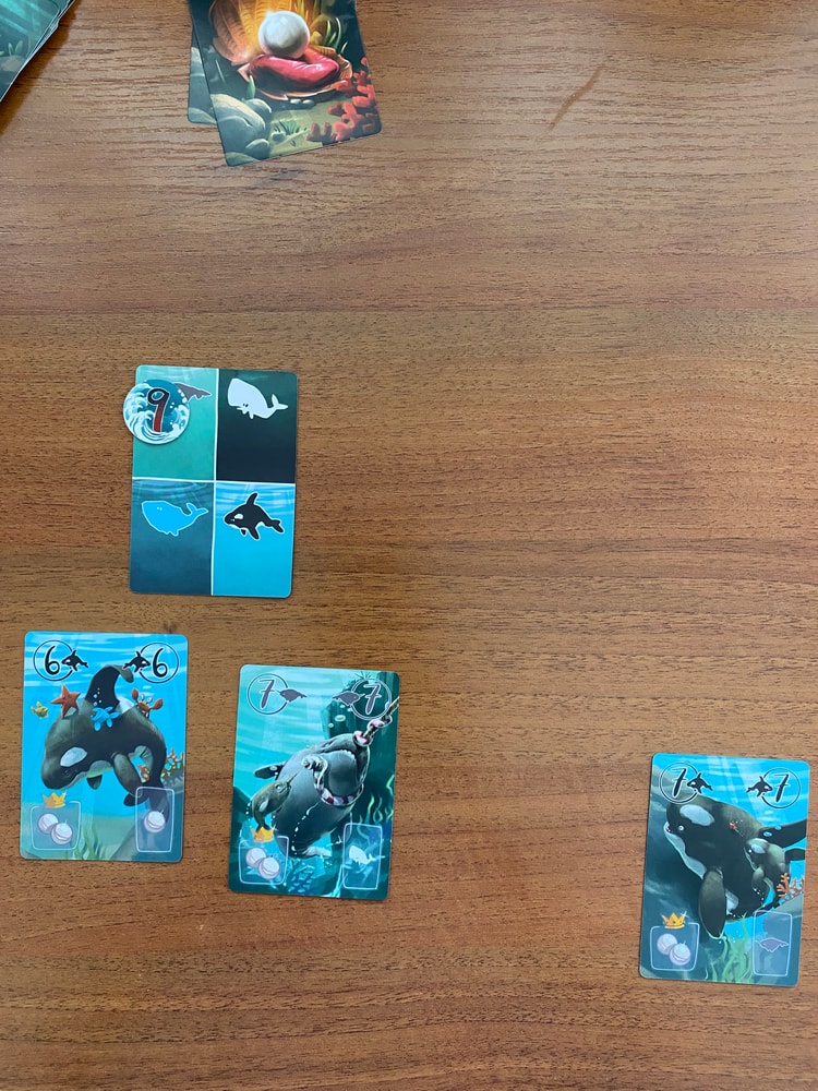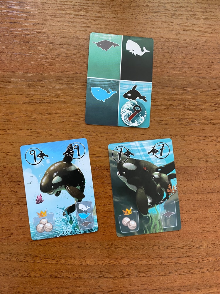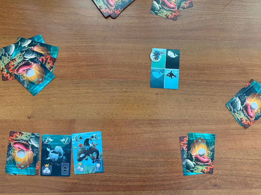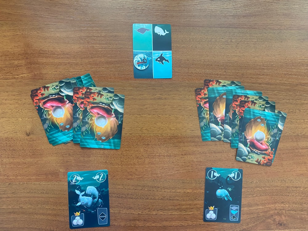 Каждому игроку раздается по девять карт. Карты двусторонние на лицевой стороне нарисованы киты, на рубашке жемчужины- это победные очки. Все остальные карты убираются в коробку.