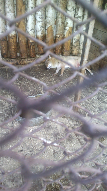 Этот волк лениво спал и совсем не страшен (похоже, что волчица), больше на собаку похож)), а вот рядом был с ним большой волчара, туда-сюда мечущийся по клетке, близко было подходить страшновато - очень хорошо ощущалось, что это хищный опасный зверь