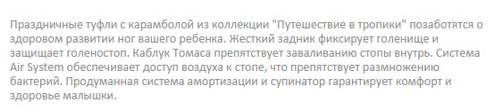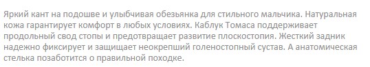 Укрепленные берцы и высокий жесткий задник позволяют надежно зафиксировать голеностоп в процессе бега и ходьбы. Каблук Томаса своей особой удлиненной формой края обеспечивает правильное развитие мышц и уменьшает нагрузку на продольный свод стопы, не давая ноге заваливаться внутрь. Супинатор предотвращает развитие плоскостопия, а передняя часть подошвы каждой модели снабжена специальной системой амортизации Shock Point. Она позволяет равномерно распределять давление по всей стопе, снижая нагрузку на позвоночник.