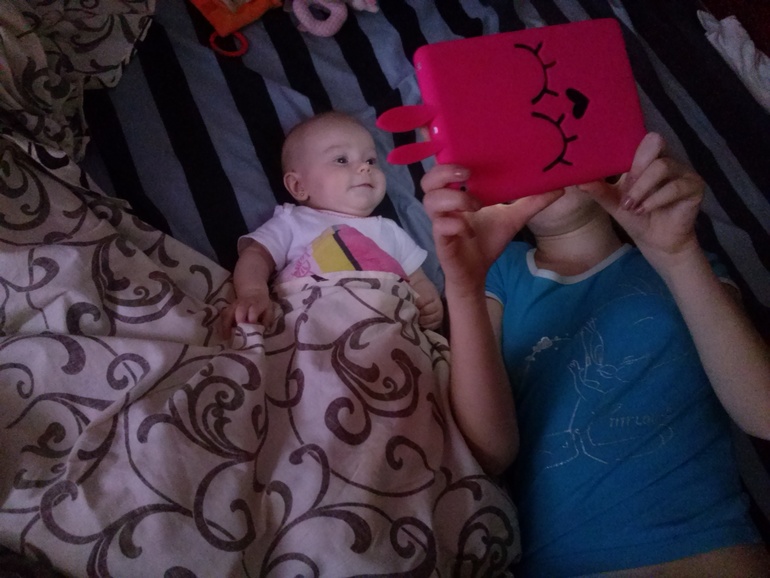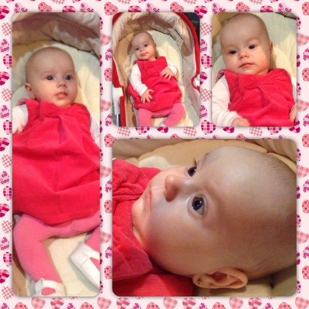 ЕваА мы очень сильно любим мультики "Tiny Love" и "котенок Мусти", можем смотреть даже полчаса!!! А еще Ева научилась пользоваться ручками))) Раньше я ей вкладывала в руки игрушки и она ими матыляла, а теперь она сама находит и берет в ручки, хватается за бортики люльки, обнимает меня и прижимается, сегодня стянула с моего рабочего стола пару документов, наверное тоже будет бухгалтером))) Пытается укусить за руки, так смешно, прошу всех нянек подсаливать руки для более пикантного вкуса)))) А если серьезно, то у нас припухшие десна и уже проглядывают наши первые зубки!!!! Активно пытаемся ползать, но пока конечно только пытаемся. Давала полизать яблочки и персик (персик пошел на ура), но пюрешки попробую давать в 4 месяца. Уже передали дальше пару пакетов нарядов, начали носить одежку на 68 см. И мама с папой сходили наконец то в сауну - это был кайф! И как обычно новые фоточки: 1. это Ева со старшей сестричкой смотрят мультики))) 2. Близнецы с разницей 22 года))) 3. Виват Король))) 4. Коллаж. 5. Наша Улыбака)))