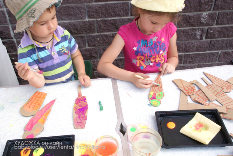 Для рисования потребуется - гофрокартон, ножницы, масляная пастель, гуашь, кисти, бусины и прочие украшения, клей-пва.