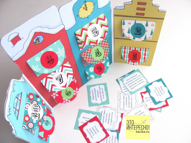 В комплект входят изображения для обложки, фона из домиков, сами конвертики с запасными цифрами (вдруг вы захотите не обратный отсчет, а просто числа декабря до 31 считать?) и три варианта карточек заданий.