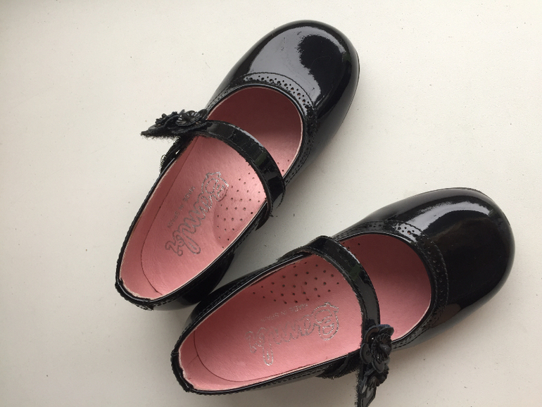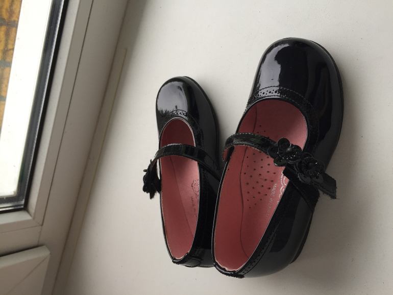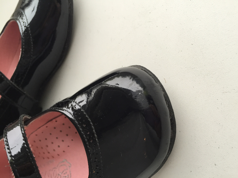 Красивые черные лаковые туфли. На маленькой ножке смотрятся очаровательно. Стелька 15,5 см. Размер 25. Есть небольшой нюанс на мысочке (потёртость), но за счёт того, что туфли лаковые и черные при носке не видно. Носили их несколько раз. Как новые. Цена 1200.