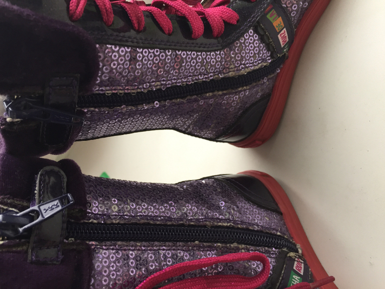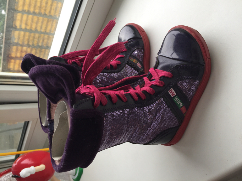Яркие как и вся обувь этой марки. Регулируются шнуровкой, сбоку молния. Размер 24. Стелька 15 см. Цена 1500.