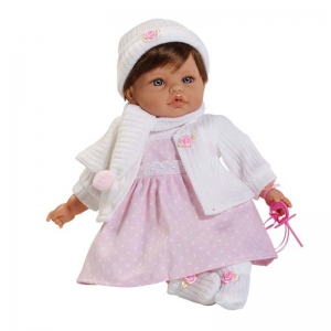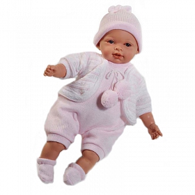 Эта кукла с мягким телом, а головой, ножками и ручками из винила, одета в костюмчик, кофточку, шапочку и носочки, как у настоящих маленьких детей. В комплект входит соска на ленточке. Если отнять соску у малыша, он будет плакать, и успокоится только тогда, когда получит соску обратно. На выбор 2 вида - мальчик в голубом и девочка в розовом. Изготовлено в Испании. Размер куклы 50 см. 3 батарейки типа "таблетка" входят в комплект. 2220 р.