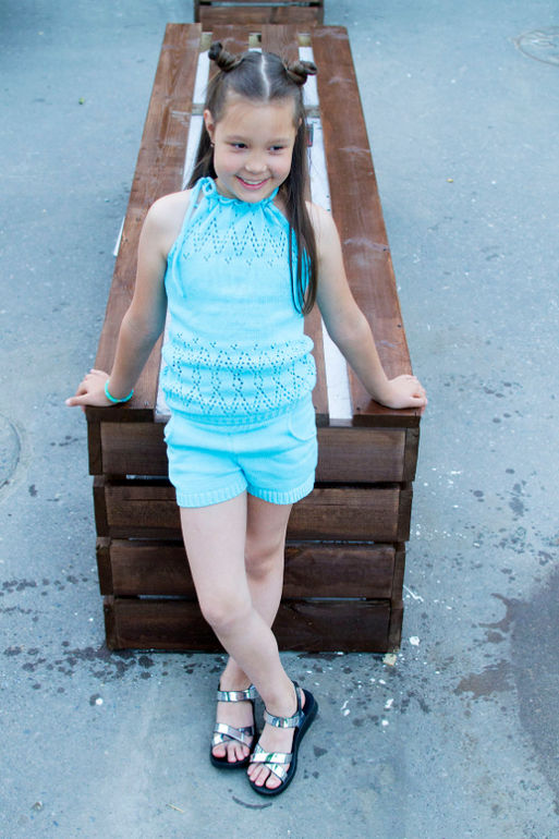 В наличии 2 цвета бирюза 122-134 и айвори 116-128, полностью дизайнерская ручная работа. такого не купить в магазине. Размер единый, т.к топ и шортики растут вместе с ребенком за счет регулируемых завязок, хватит на 2 летних сезона.