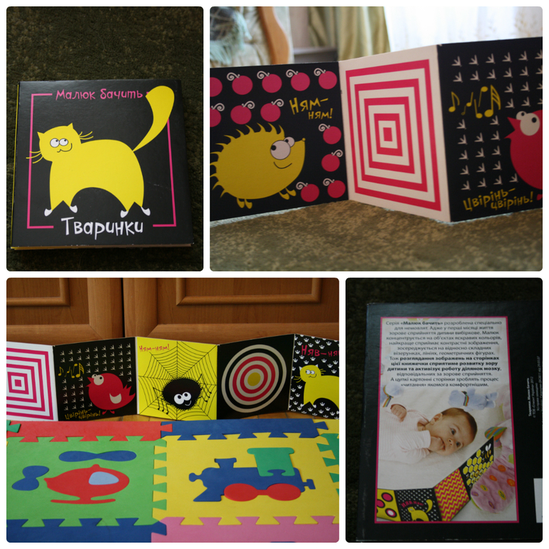 У нас такая книжечка стоит возле игрового коврика, когда малыш на нем играется, его очень прет разглядывать картинки. )