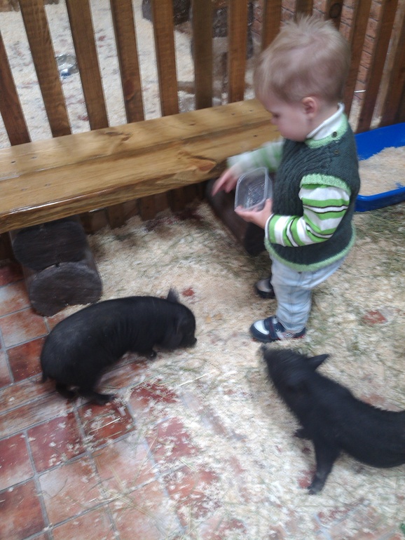 еще катались на поезде, а апогеем всего стал ручной зоопарк. Покормили всех зверей, но самыми любимыми стали мини пиги