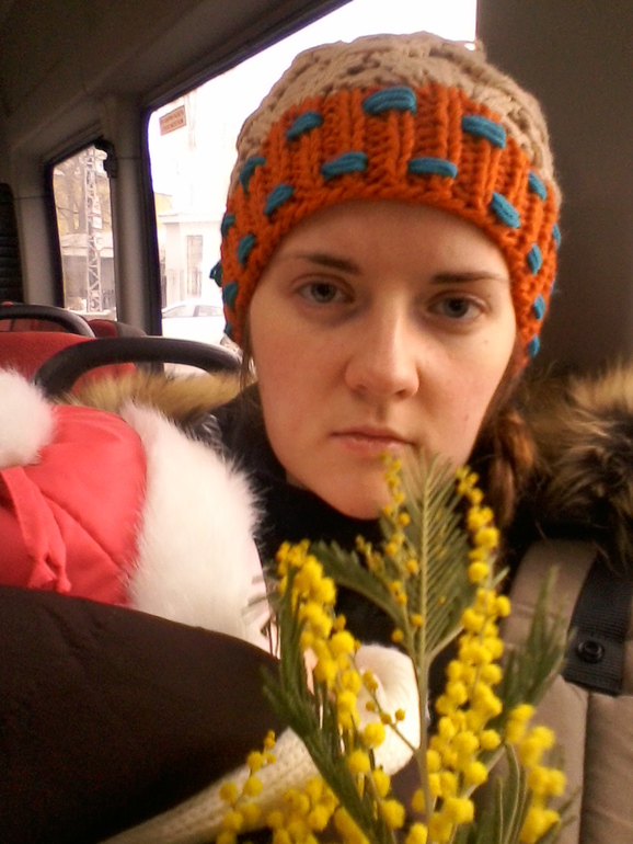 Вот так вот мы с Дарьей сегодня косплеили Маргариту (альтернативный вариант). Суета в городе несусветная. Хомячки бегают туда-сюда, закупаются к празднику, будь он неладен, несмотря даже на космические цены. Ну а мы просто вышли за подгузами и прочей повседневщиной, заодно приобрели метёлочку мимозы (люблю её запах).