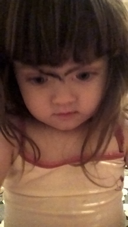 Активно интересуется моей косметикой. Пожалуй, даже активнее, чем я) Обожает всякие мазюльки, красульки и рисовашки на лице. Видимо, Крыгиной насмотрелась вместе со мной) Брови-то каковы, а?!