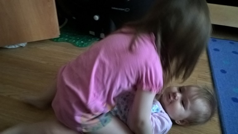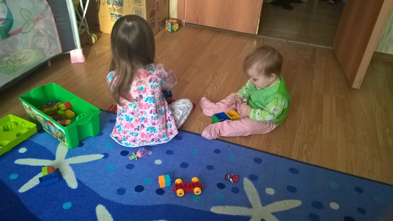 С сестрой отношения стали сложнее. Сашка уже не та кукла, которой можно просто умиляться, она уже вполне самостоятельная творческая единица в игрищах. И, как следствие, имеют место некоторые конфликты. Разумеется, физически Дарья пока побеждает, но она уже знает, что просто так отбирать игрушки нельзя и надо предложить что-то взамен. Раньше это прокатывало без проблем, но теперь у Сашки появилось своё мнение. Зато и взаимодействия стали у них сложнее. Они могут хихикать подолгу вместе, корчить рожицы друг другу, а могут просто тихо играть рядышком.