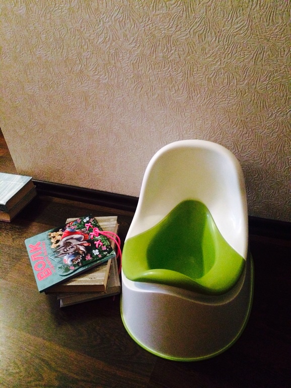 Проблема оказалась проще-горшок большой,ноги до пола не достают.поэтому до субботы пока не куплю новый надо было придумать как исправить ситуацию,и я не придумала ничего лучше чем подложить под ноги книги.когда наш папа это увидел,выдал только одну фразу про читающую страну ;)