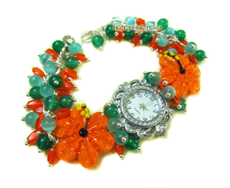 оранжевый, часы, часики, наручные часы, наручные часы в подарок, женские часы, браслет с часами, часы с браслетом, часы-браслет, часы с цветами, стеклянные цветы, цветы лэмпворк, lampwork (лэмпворк), lampwork, авторский лэмпворк, подарок девушке, подарок женщине, оранжевые часы, гибискус, зеленый