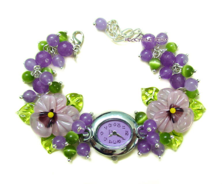 фиолетовый, часы, часики, наручные часы, наручные часы в подарок, женские часы, браслет с часами, часы с браслетом, часы-браслет, часы с цветами, стеклянные цветы, цветы лэмпворк, анютины глазки, анютки, lampwork (лэмпворк), lampwork, авторский лэмпворк, подарок девушке, подарок женщине, сиреневый