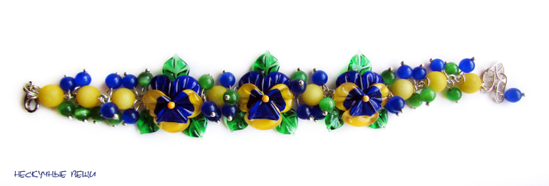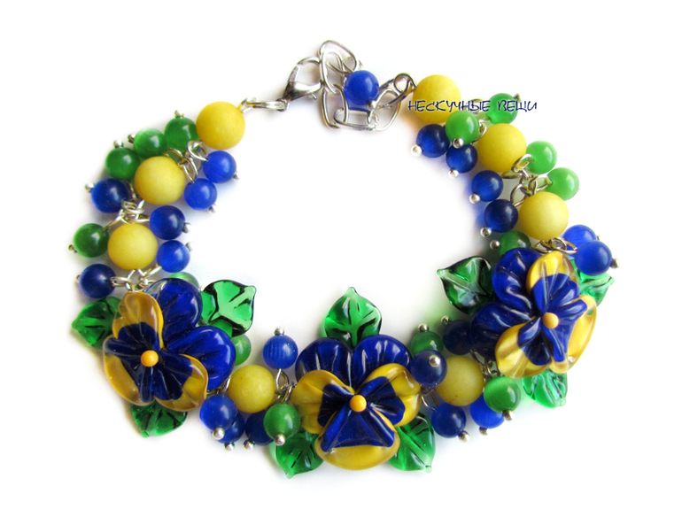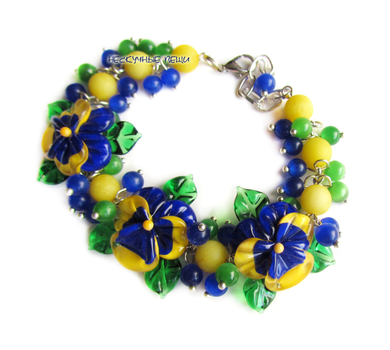 браслет, браслет с цветами, lampwork (лэмпворк), lampwork, авторский лэмпворк, анютины глазки, анютки, браслет лэмпворк, подарок девушке, подарок женщине, стеклянные цветы, фиалки, синий, желтый, сине-желтый, синий браслет, цветочный браслет