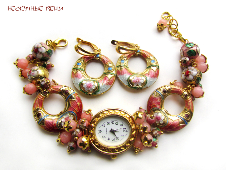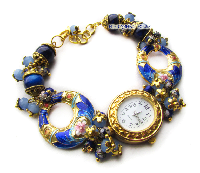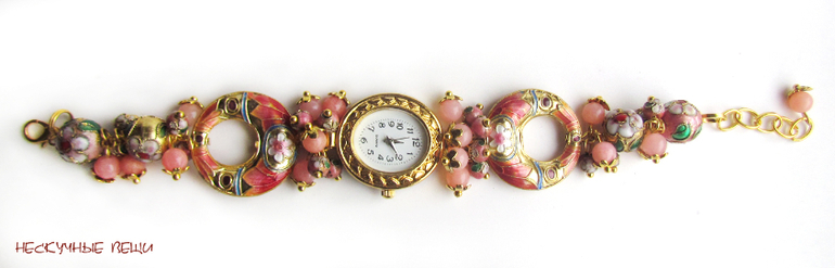 клуазоне, кварц, фарфоровые бусины, кварцевые часы, фурнитура под золото