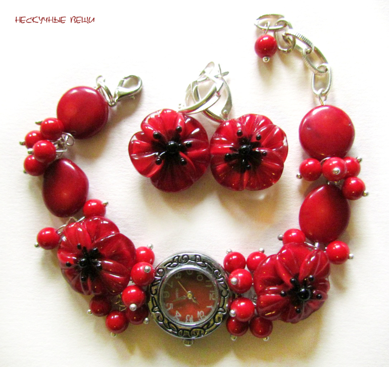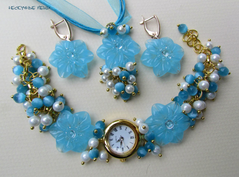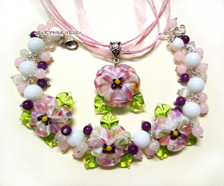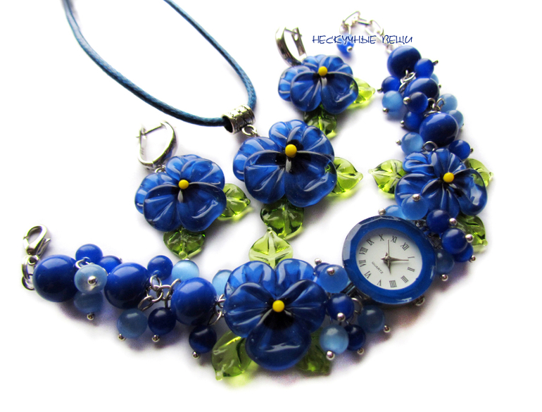 Комплект (часы, кулон и браслет) с цветами лэмпворк