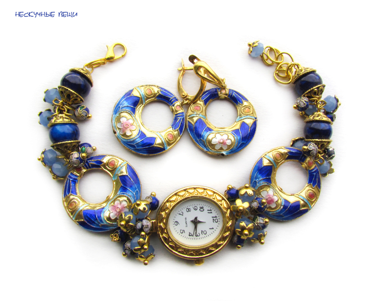 часы, часики, наручные часы, часы-браслет, часы с браслетом, браслет с часами, Клуазоне, подарок девушке, подарок женщине, женские часы, золотой, золотистый, золотые часы, белый, сине-золотой, синий комплект, набор, комплект с клуазоне, синий набор, часы и серьги