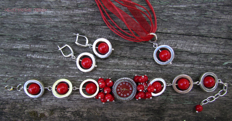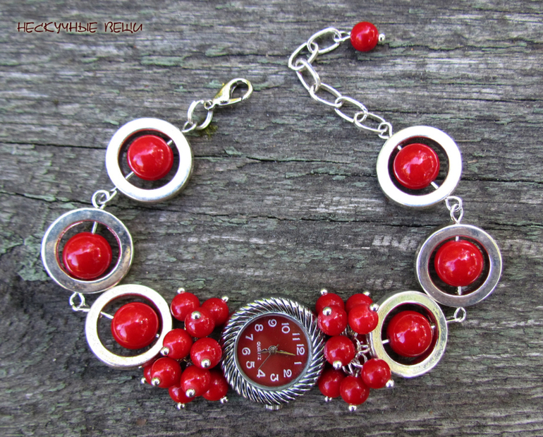 прессованный коралл, металлофурнитура, серебряные швензы, кварцевые часы