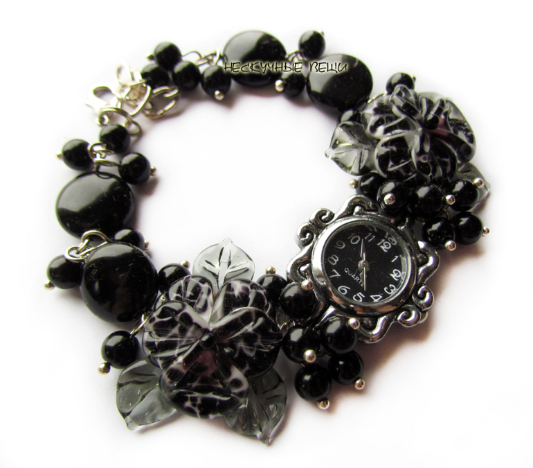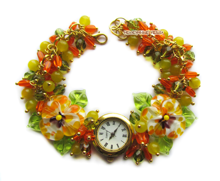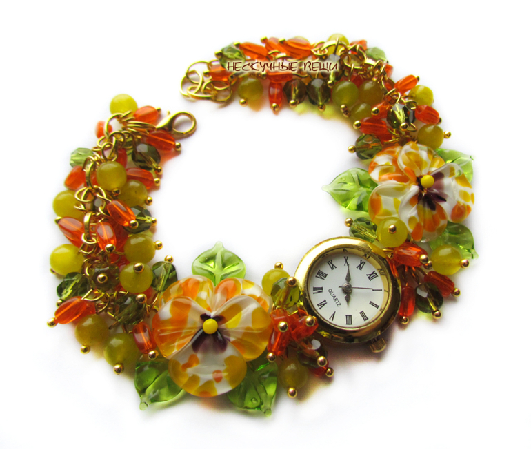 авторские бусины лэмпворк (lampwork), жадеит, халцедон, кварцевые часы, металлофурнитура