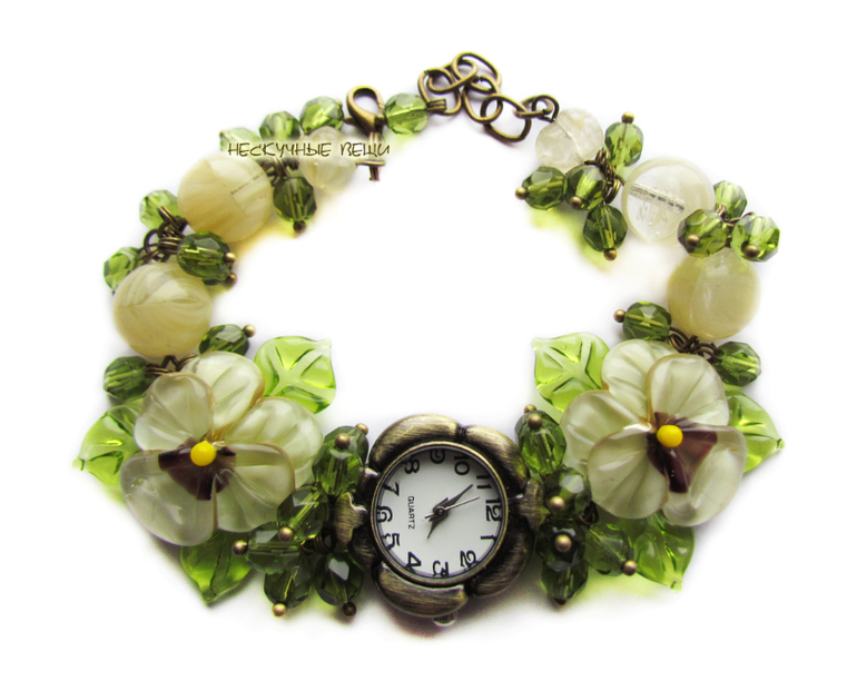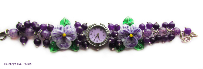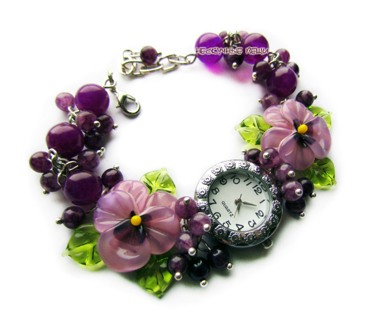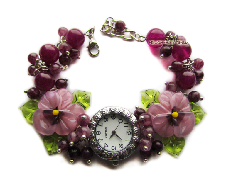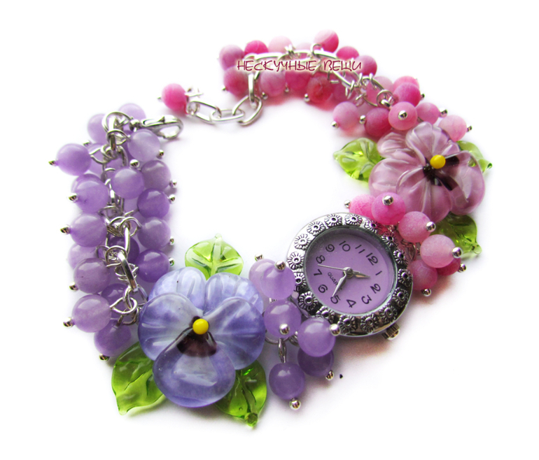 часы, часики, наручные часы, наручные часы в подарок, часы-браслет, браслет с часами, часы с браслетом, часы с цветами, авторский лэмпворк, lampwork (лэмпворк), lampwork, анютины глазки, анютки, стеклянные цветы, подарок девушке, подарок женщине, фиалки, розовый, розовые часы, сиреневый