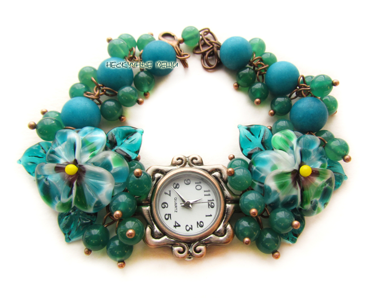 авторские бусины лэмпворк (lampwork), агат, нефрит, медная фурнитура, кварцевые часы