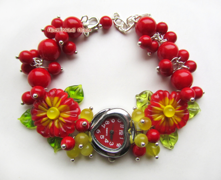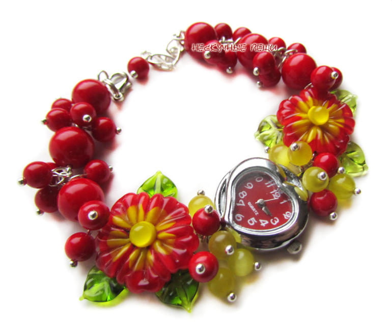 ярко-красный, красный, красные часы, часы, наручные часы, наручные часы в подарок, женские часы, часы-браслет, часы с браслетом, браслет с часами, часы с цветами, стеклянные цветы, подарок девушке, подарок женщине, красные цветы, авторский лэмпворк, lampwork (лэмпворк), lampwork, цветы, цветы в украшении