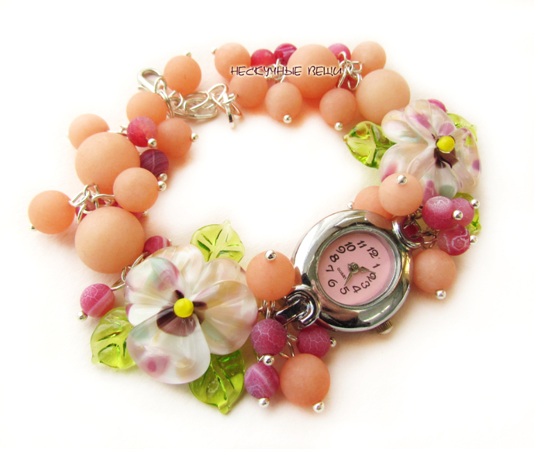 авторские бусины лэмпворк (lampwork), агат, кошачий глаз, кварцевые часы, металлофурнитура