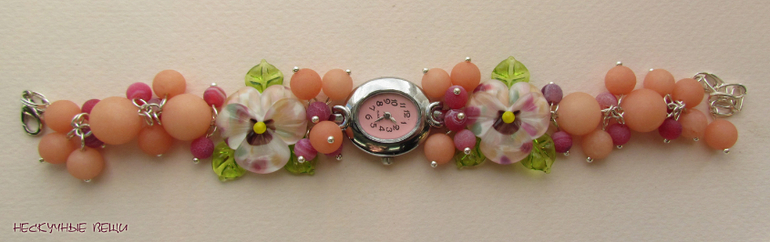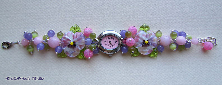бледно-розовый, часы, наручные часы, наручные часы в подарок, женские часы, часы-браслет, часы с браслетом, браслет с часами, часы с цветами, стеклянные цветы, анютины глазки, анютки, подарок девушке, подарок женщине, авторский лэмпворк, lampwork (лэмпворк), lampwork, розовые цветы, фиалки, розовый